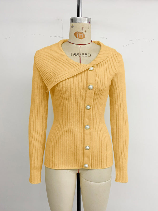 Pearl embellished solid color asymmetrical V-neck slim-fit sweater