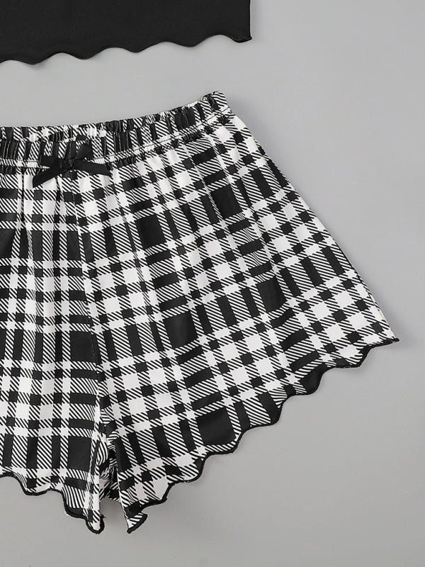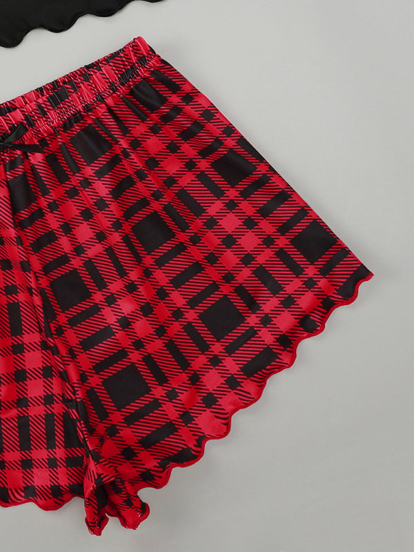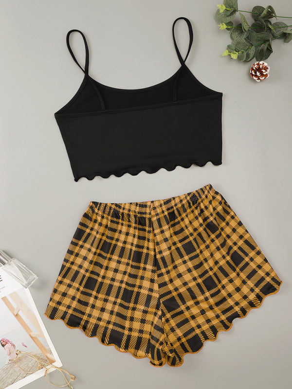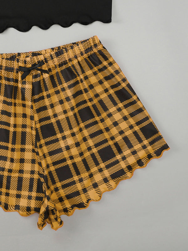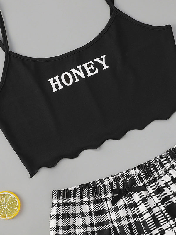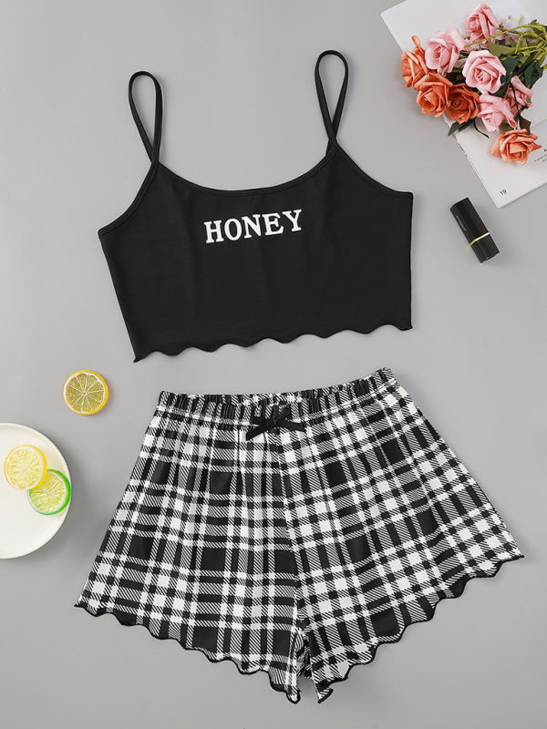 Women's Letter HONEY Printed Camisole + Plaid Printed Shorts Homewear Set